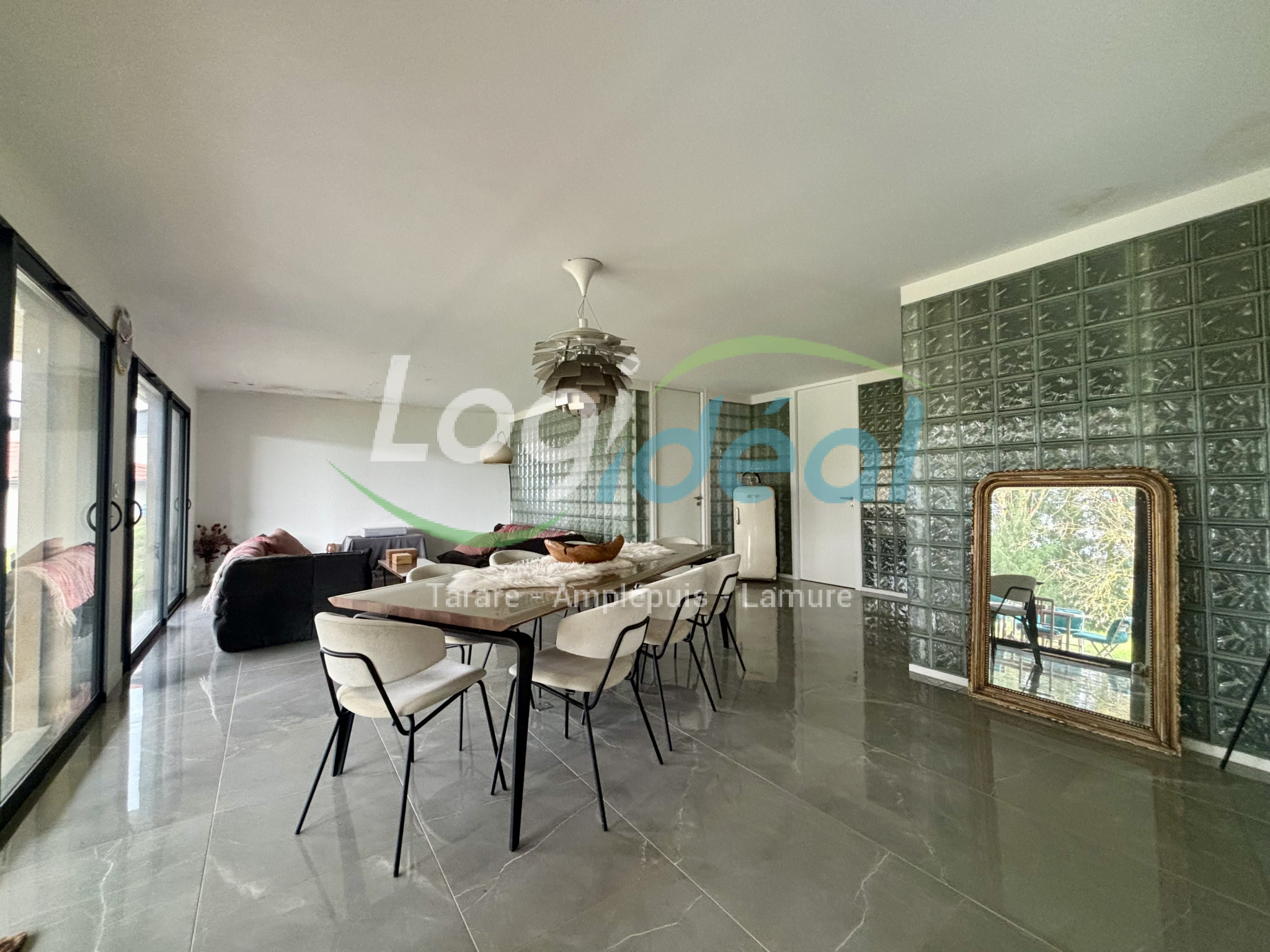 baigné de lumière par de grandes baies vitrées, ouvert sur une cuisine équipée, carrelage